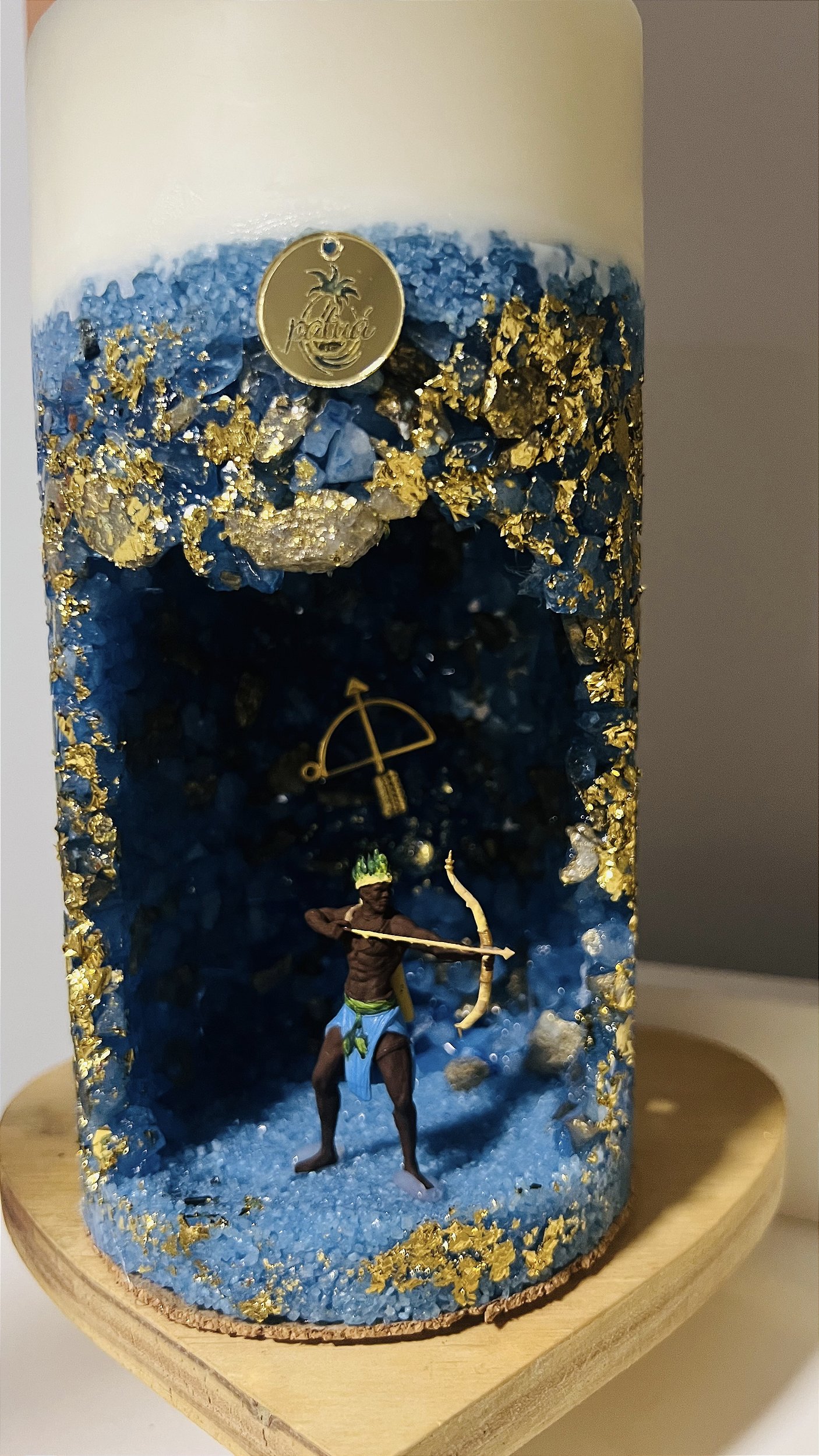 A Encantos do Axé é mais do que uma vela — é um portal de conexão com as forças sagradas da Umbanda e do Candomblé. Moldada como uma gruta ancestral, com acabamento em pedra, ela abriga em seu interior representações de diferentes Orixás, de Exu a Oxalá, irradiando energia, equilíbrio, proteção e poder.